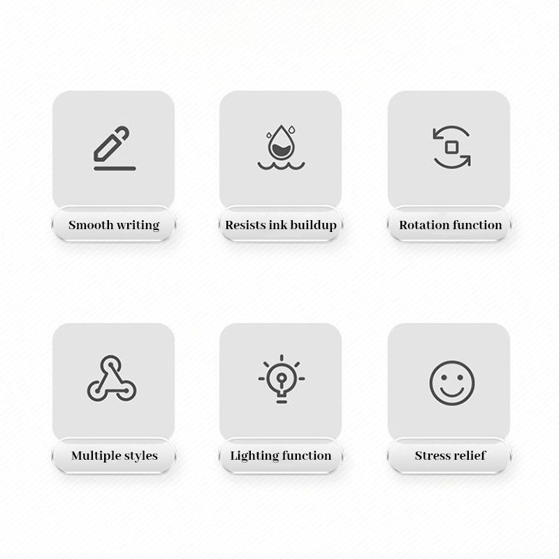 Meet the Pen Spinner! With a built-in fidget spinner, this pen is perfect for those who like to fidget. The pen also has an ultra-bright mini LED light and a built-in gyroscope.